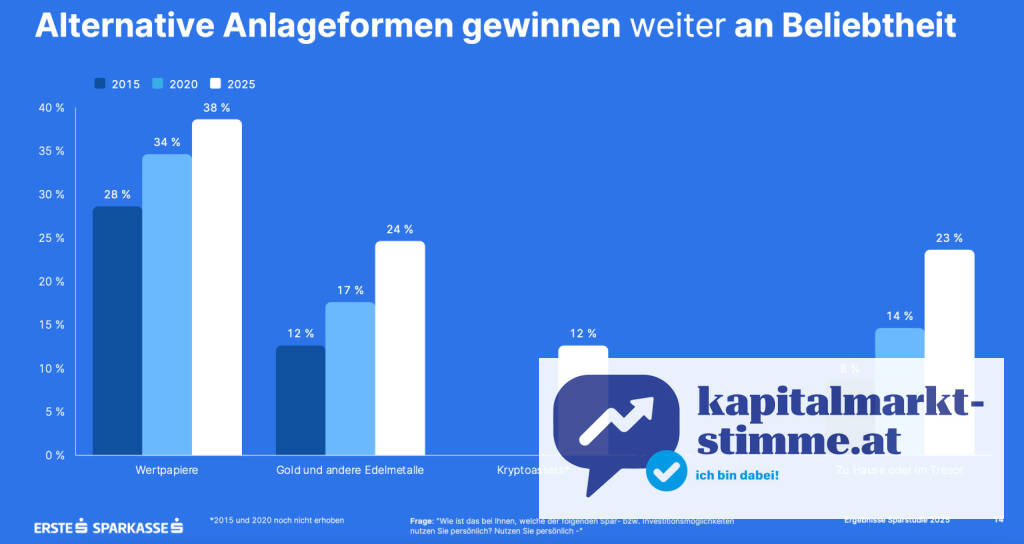 Zum 100. Mal wird in diesem Jahr der Weltspartag begangen und die jährliche Sparstudie von Erste Bank und Sparkassen zeigt auf, dass Sparen bei den Österreicher:innen ein wichtiges Anliegen bleibt. Für 80 Prozent ist Sparen „sehr“ oder „ziemlich wichtig“. Die Sparquote ist laut Statistik Austria in 2024 gestiegen, und zwar von 8,6 auf 11,7 Prozent. In absoluten Zahlen legten die privaten Haushalte 2024 damit in Summe rund 34 Mrd. Euro zur Seite – ein Plus von 46 Prozent gegenüber 2023 (23,3 Mrd. Euro). Für 2025 erwartet das WIFO, dass die Sparquote leicht auf 10,7 Prozent sinkt (2024: 11,7 Prozent). In der Veranlagung selbst gewinnen alternative Anlageformen weiter an Bedeutung. Im Zehn-Jahres-Vergleich stieg der Anteil jener, die in Wertpapiere investieren, von 28 Prozent auf 38 Prozent. Besonders aktiv zeigt sich dabei die Generation Z: Fast jede:r Zweite (48 Prozent) setzt auf diese Anlageform. Auch Edelmetalle wie Gold sind gefragt – ihr Anteil hat sich seit 2015 verdoppelt (von 12 Prozent auf 24 Prozent). Kryptowährungen verzeichnen ebenfalls ein starkes Wachstum: Während sie bei der erstmaligen Erhebung 2022 nur für 2 Prozent relevant waren, sind sie heute bereits Teil des Veranlagungsmixes von 12 Prozent der Österreicher:innen. Das klassische Sparkonto bleibt dennoch die beliebteste Anlageform. Nach den Zinsentwicklungen der letzten Jahre nutzen es wieder 80 Prozent, nachdem es 2020 in der Nullzinsphase nur 72 Prozent waren.