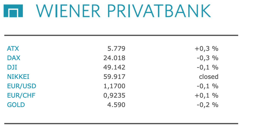 Aus den Morning News der Wiener Privatbank: "Die Wiener Börse hat gestern Dienstag leicht zugelegt. Der Leitindex ATX gewann 0,27 Prozent auf 5.779,43 Punkte. Der breiter gefasste ATX Prime fand sich zum Schluss mit plus 0,19 Prozent bei 2.858,24 Zählern. Die wichtigsten europäischen Börsen beendeten den Tag mehrheitlich mit Abschlägen. Im Iran-Krieg gab es zwischen den USA und dem Iran keine echten Fortschritte, die Krise könnte noch länger andauern. Washington fordert eine sofortige Klärung des Atomprogramms, während Teheran auf Zeit spielt und priorisiert, den militärischen Konflikt sowie die Spannungen im Golf zu entschärfen, hieß es in einer Einschätzung des Analyse-Dienstes Index Radar. Es mehren sich die Stimmen, dass der Konflikt noch einige Wochen andauern könnte. Auch eine weitere Eskalation wird nicht ausgeschlossen.