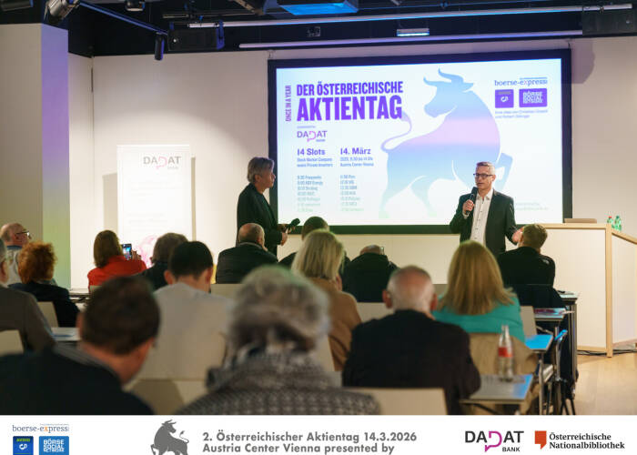 - Main Events 2026. Für 14. März (9:30 bis 14:30 Uhr) luden Börse Social Network und Börse Express im Rahmen des 10. Börsentags Wien (B2MS) zum 2. Österreichischen Aktientag http://www.boersentag.at . Es präsentierten Frequentis, ADX Energy, Strabag, FACC, Palfinger, oekostrom, Cyan, Porr, VIG, UBM, Polytec, WEB Windenergie und Semperit. Unsere Print-Sondernummer (siehe Seitenteil) wurde 1200x an interessierte BesucherInnen abgegeben, gesamt waren +2000 Leute am 14. März im Austria Center Vienna zu Gast. Danke an alle, für 2027 gibt es bereits Slot-Reservierungen und 2026 werden wir noch Österreich-Specials bei deutschen Börsentagen machen. Stay tuned.
